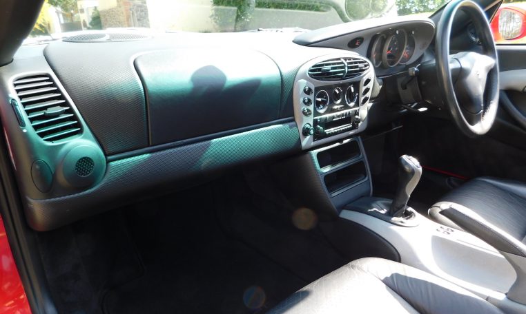 The first owner, from Abergavenny, ordered his Boxster with a rare option at the time – the SportDesign package (option code 012) which included diamond pattern trim to the dashboard, door panels and centre console, contrast Graphite Silver painted plastics, black leather sports seats with Graphite Silver painted seat backs, and black leather instrument binnacle top cover and passenger airbag cover. Heated seats, a 3-spoke steering wheel, and a Becker Porsche CR-22 cassette radio with 6-disc CD autochanger completed the specification.
